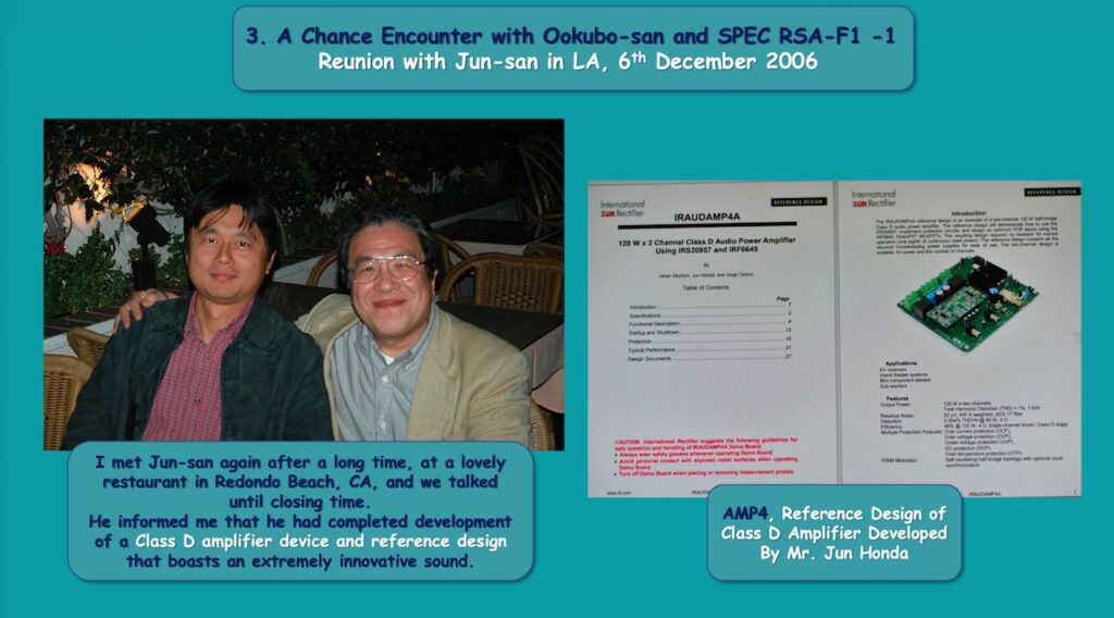 Well, I think the RSA-F1 was probably the first authentic and high-quality PWM Class D amplifier in the world and was really based on a splendid Class D reference design, which we called AMP4. The official name, IRAUDAMP4, was developed by my close and long friend Mr. Jun Honda, who is now the authority in the field of Class D design, in 2006, when he was working at International Rectifier in LA.