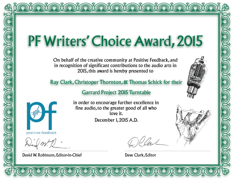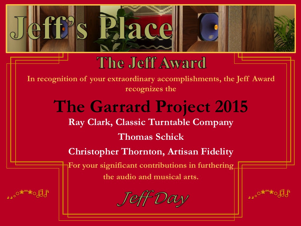 - A Garrard Project 2015 Award to Ray Clark of Classic Turntable Company, Christopher Thornton of Artisan Fidelity, and Thomas Schick,