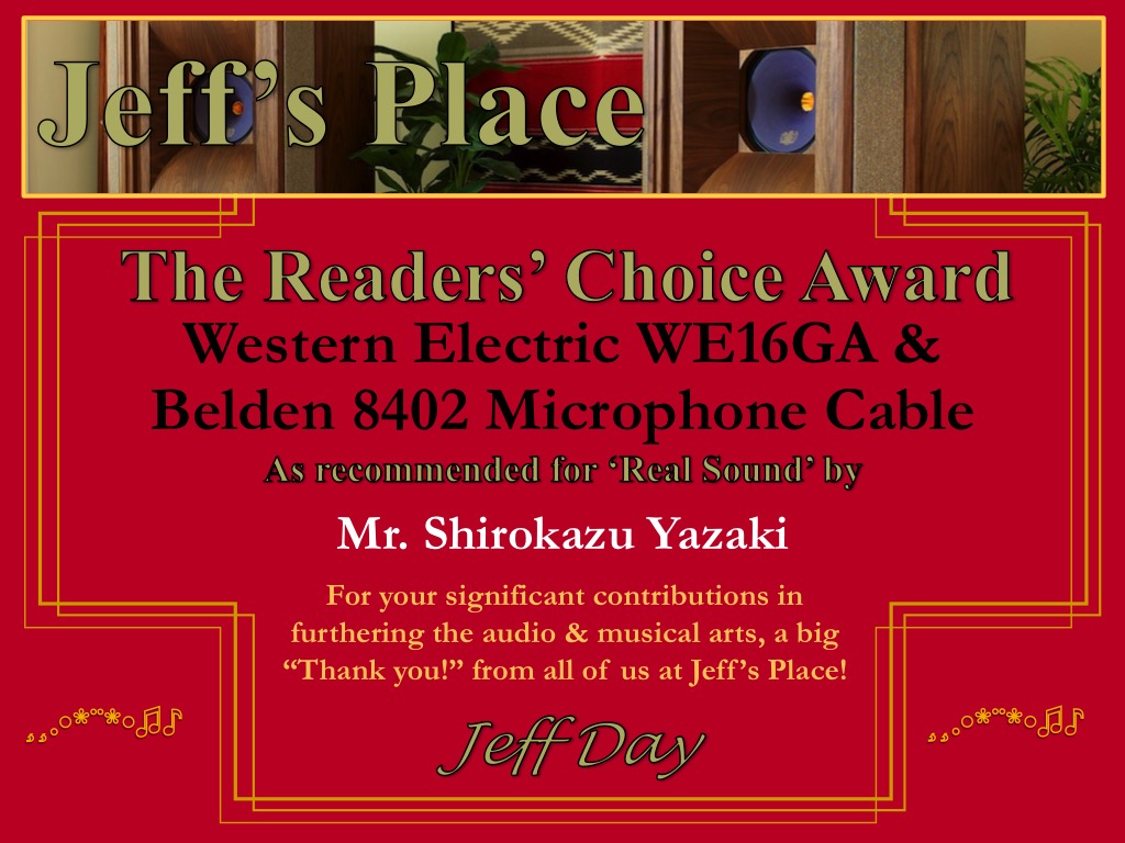 - The Readers' Choice Award to Mr. Shirokazu Yazaki for his ‘Real Sound’ recommendations of the Western Electric WE16GA wire and the Belden 8402 microphone cable.