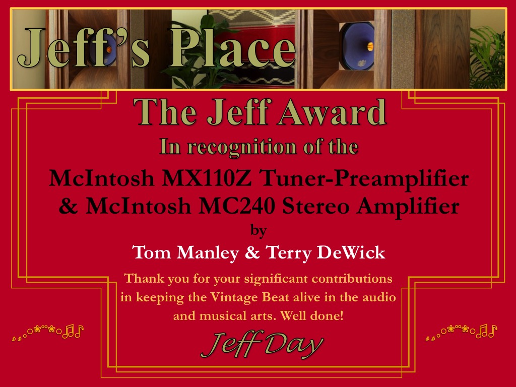 - A Vintage Beat Award to Tom Manley & Terry DeWick of McIntosh Home Audio & DeWick Repairs for their McIntosh MX110Z tuner-preamplifier &e McIntosh MC240 stereo amplifier restorations.