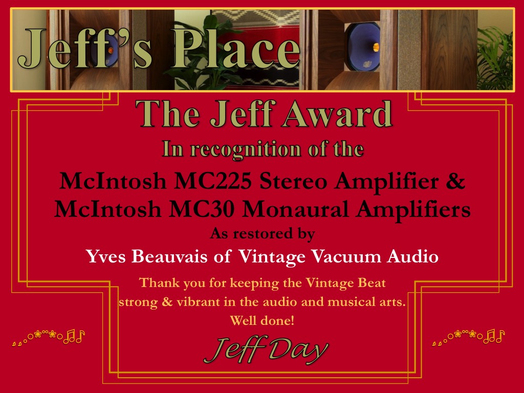 - A Vintage Beat Award to Yves Beauvais of Vintage Vacuum Audio for his McIntosh MC30 monaural amplifiers & McIntosh MC225 stereo amplifier restorations.
