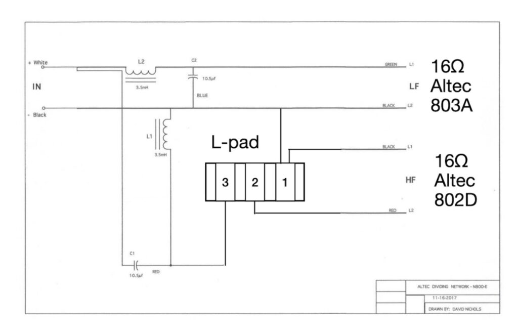 Pete’s idea of eliminating the Altec adjustable high-frequency resistor network and replacing it with an L-pad turned out to be another major serendipitous moment in this project, and would end up being important for realizing the ultimate performance the N800E crossover circuit is capable of.